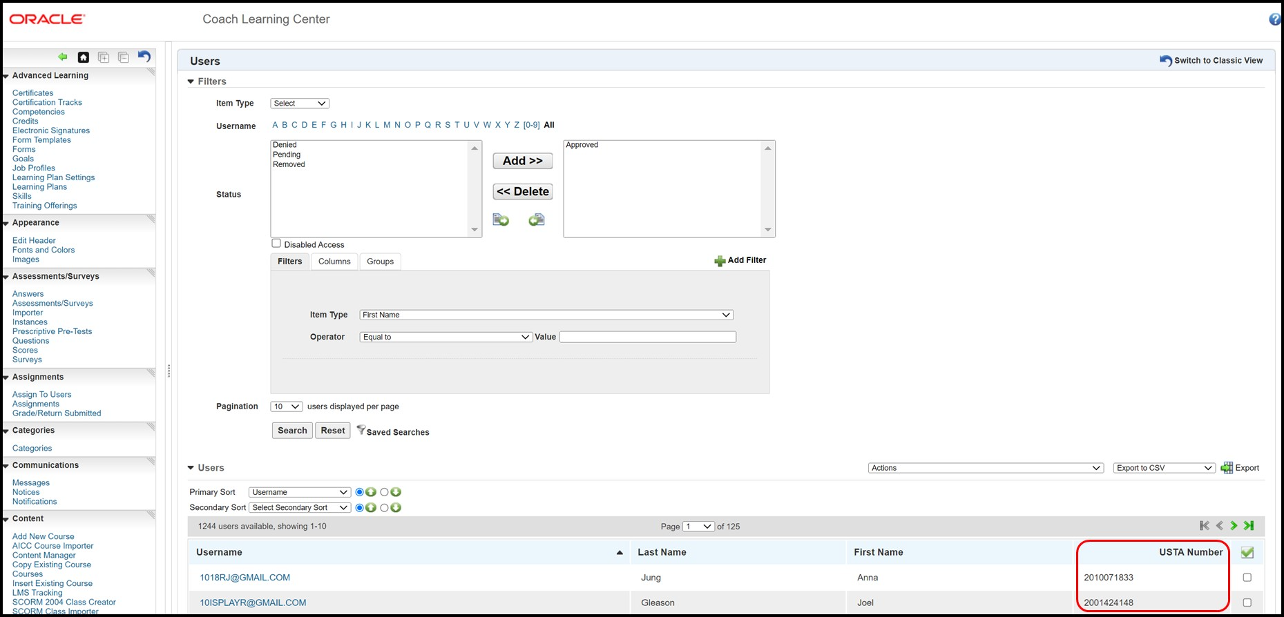 To verify this, please search the user by name using the non-Classic View, as it displays the USTA Number column. [see image below]