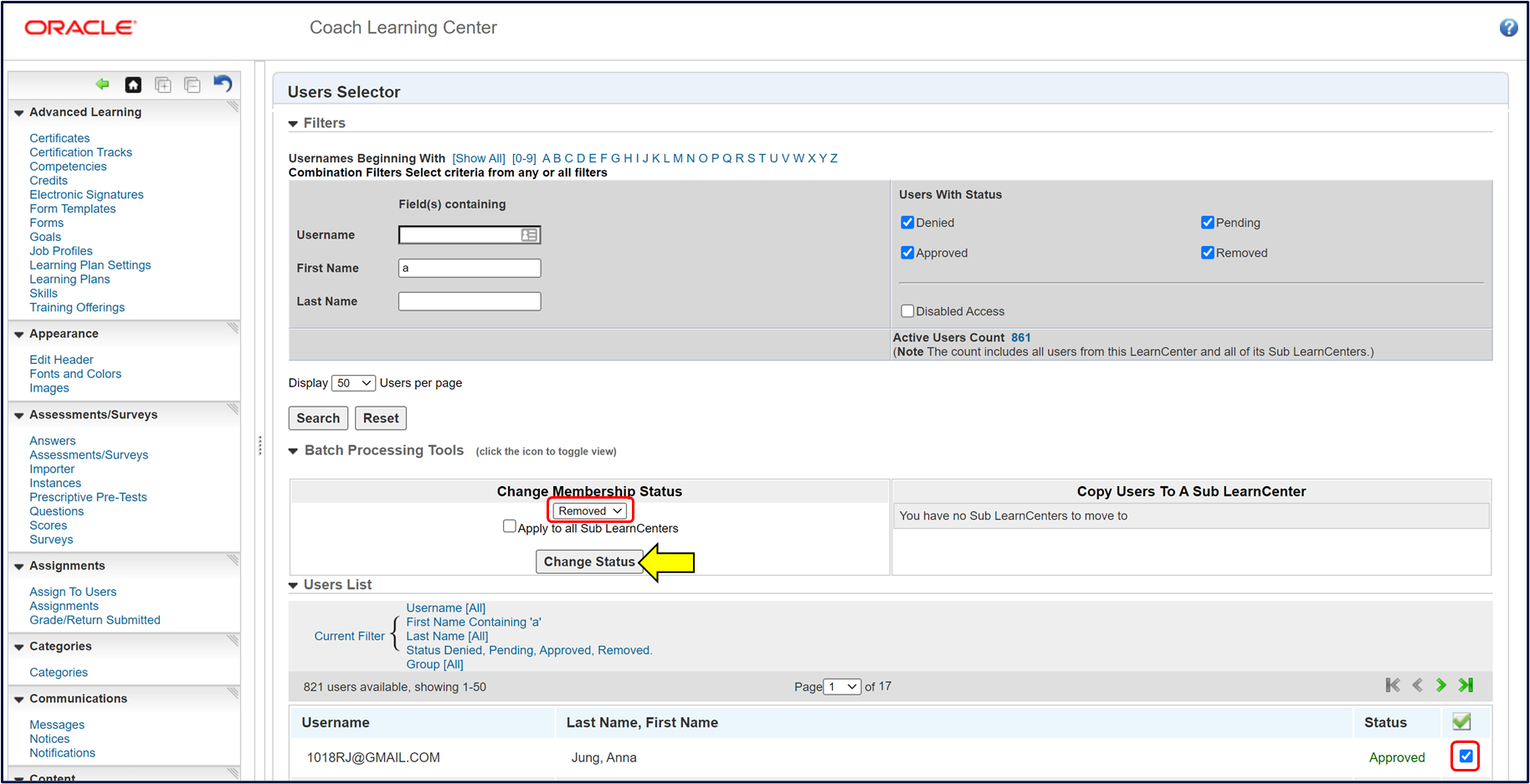 If this situation occurs, please ask the coach which account they want to keep and set the other account as Removed. Be sure to NOT check the 'Apply to all Sub LearnCenters' box as this should only be for Coach Learning Center. [see image below]